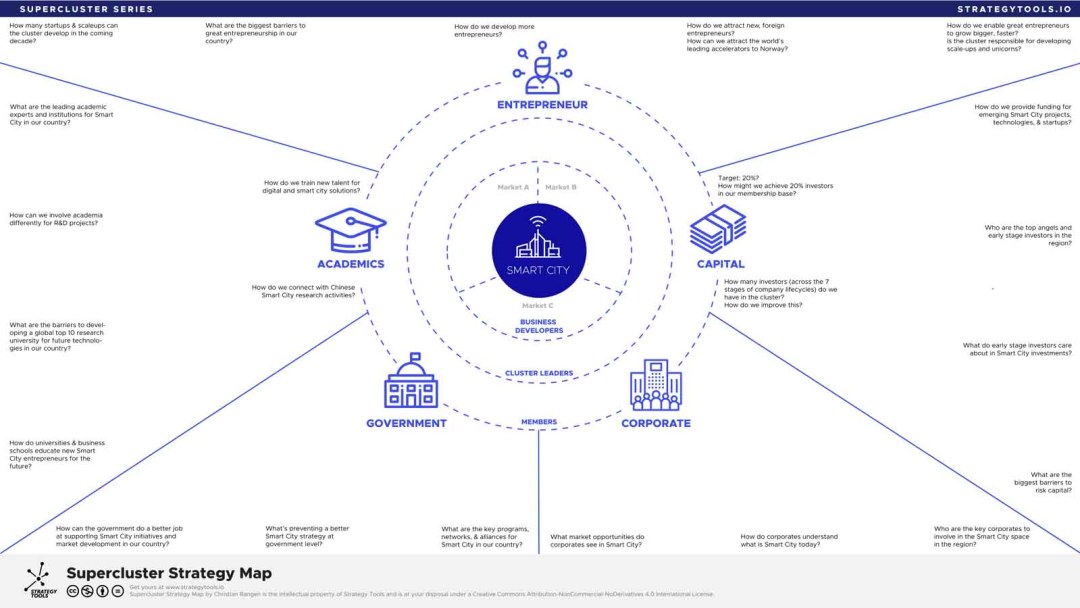 Built on the research by MIT, Harvard, and BI Norwegian Business School, the Supercluster Strategy Map details the five fundamental pillars of building a supercluster – corporate, government, academics, capital, and entrepreneur. It helps you map out a supercluster strategy and how you can involve, engage and activate all stakeholders in a supercluster development project.